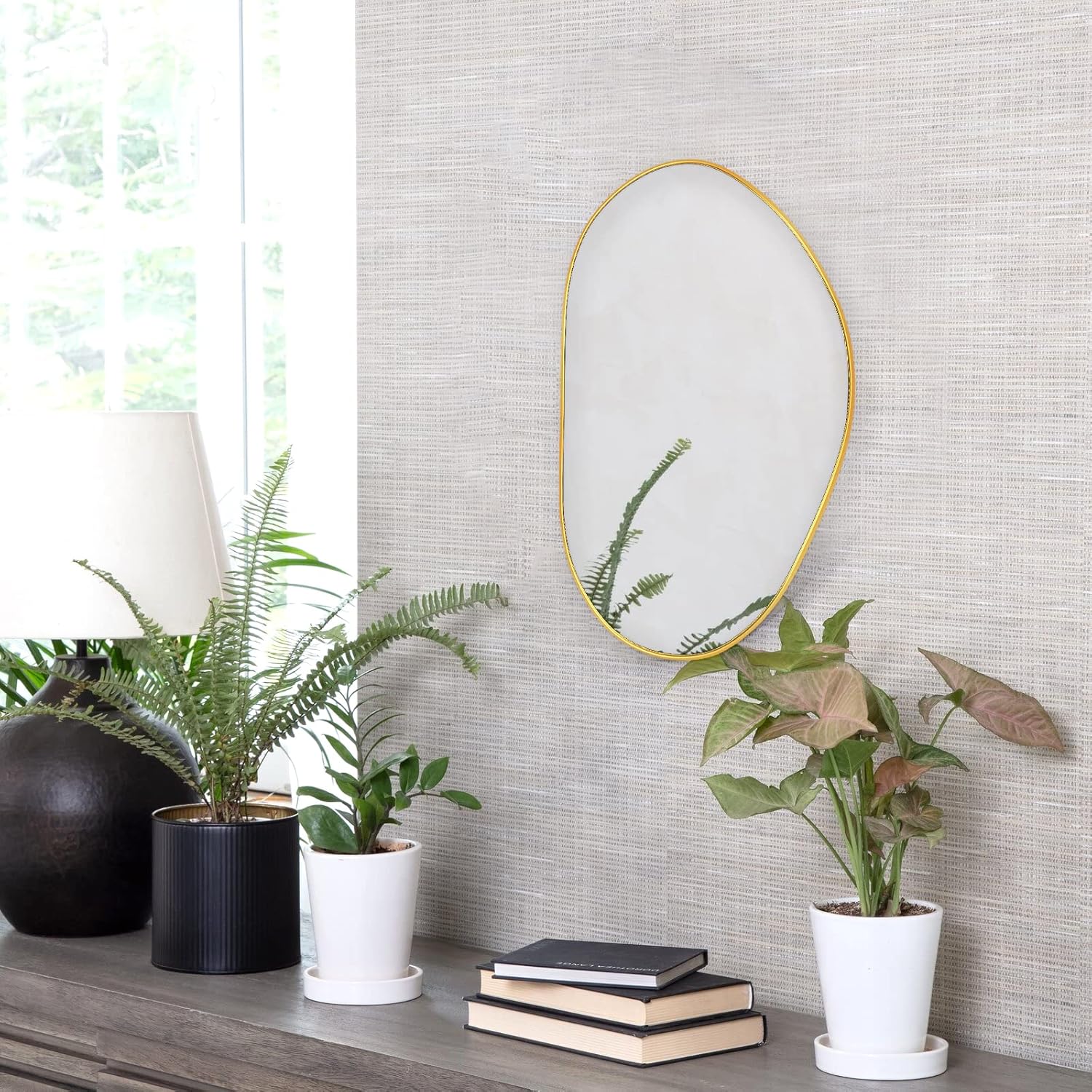 - BEAUTY YOUR SPACE with BRASS MIRROR: Sometimes a blank space of wall just need something to decor. Decor a premium brass mirror and let the large irregular mirror help contrast the design of your room and reflect the light to brighten your room. You would be surprised with the beauty brought by the simple and brass framed mirror.