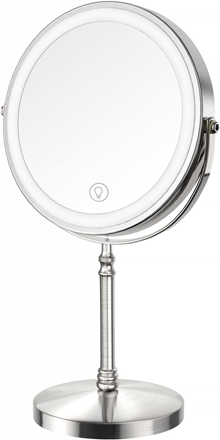 - 【10X Magnifying Double Side High Definition】 1X/10X magnification, classic dual-sided design makes this led makeup mirror much more easier to get a flawless makeup look. Both sides effect not only for makeup, but also for face details like wearing contact lenses, trimming eyebrows, shaving, hair styling, facial treatments or applying mascara. Warm Tips: When using a 10x magnifying glass, please keep your face 6 inches away from the mirror to avoid dizziness.